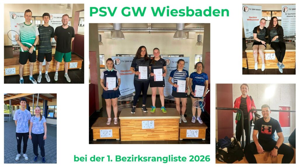 Der PSV gratuliert allen Teilnehmenden zu ihren Erfolgen bei der ersten Bezirksrangliste 2026. Am 30.+31. Mai sowie am 13.+14. Juni folgen die weiteren Ranglistenturniere des Badmintonbezirks Wiesbaden. Über alle aktuellen Turniere könnt ihr euch immer auf unserer Turnierseite informieren.